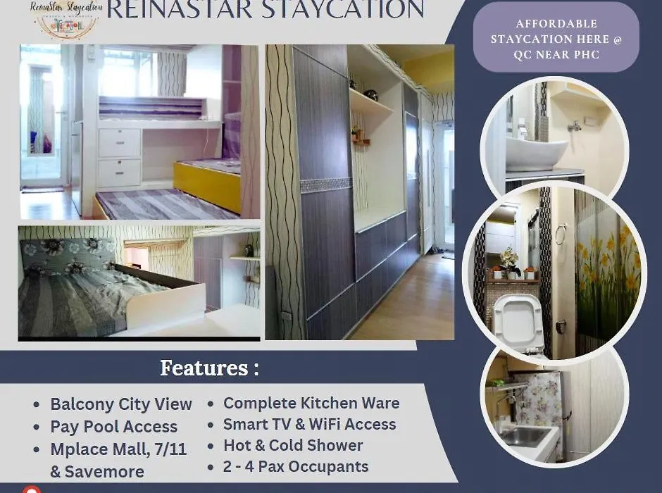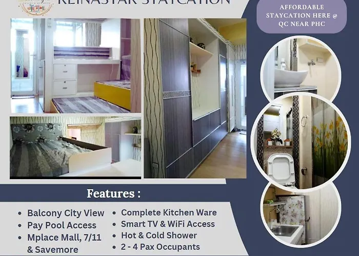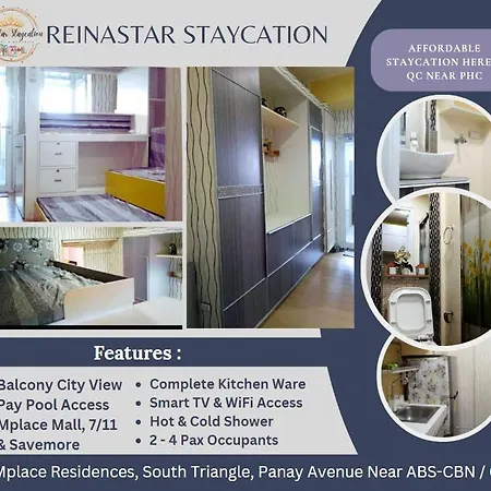 Offering air-conditioned rooms, Reinastar Staycation @ Mplace Residences Manila hotel is only a 5-minute walk from the Crossings Department Store. There is a restaurant available on the premises.